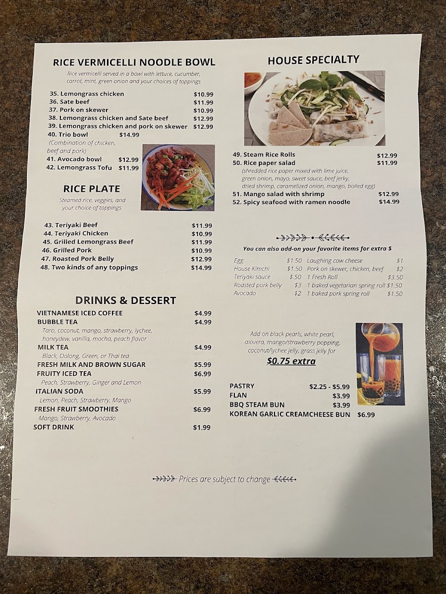 But that’s not all! For those looking to mix up their meal, try the House Specials, like the comforting Spicy Seafood with Ramen Noodle (CA$15.99) or the light and refreshing Mango Salad with Shrimp (CA$15.99). These dishes showcase the versatility of Vietnamese cuisine and are crafted with the freshest ingredients, ensuring a delicious experience every time.
